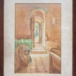 - Watercolour of the entrance to All Saints’ Church, Compton before its 1905 extension, showing the different position of the font. Written on the back: “Irene Whatmore, Larchwood, Compton”