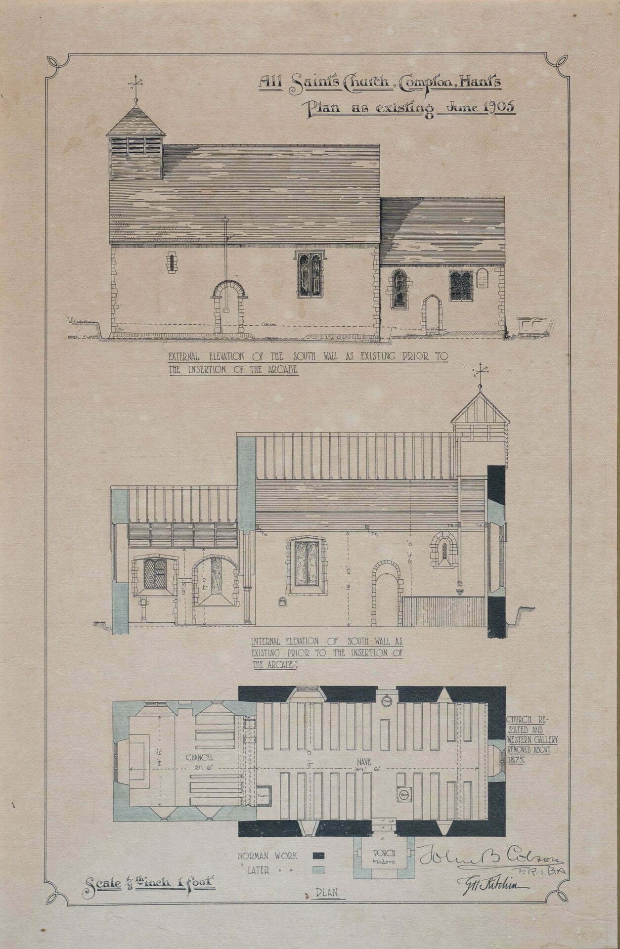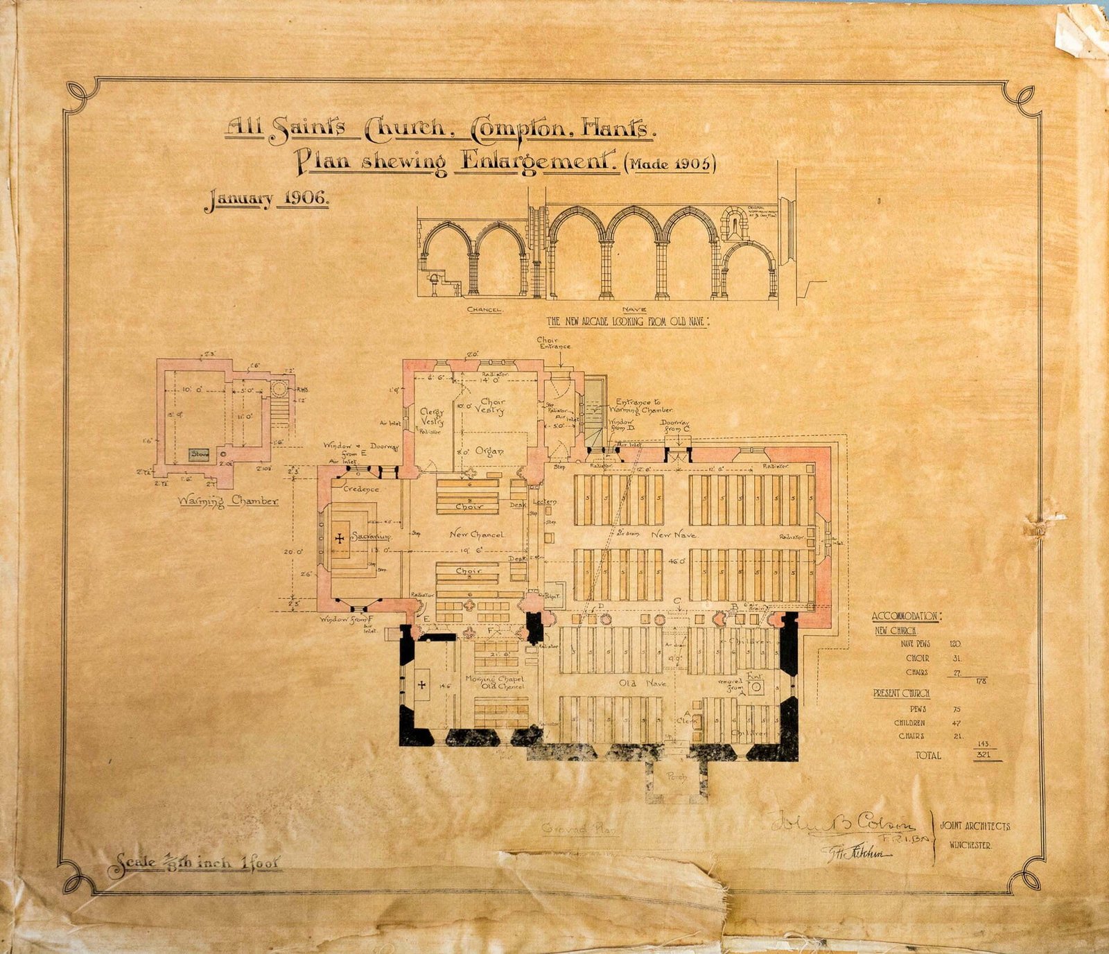- Architects’ drawings of Compton Church after the 1905 extension. Reproduced by permission of the Hampshire Records Office. Item reference 1M76/PW16 The drawing identifies windows which were moved from the old church and shows their new location.