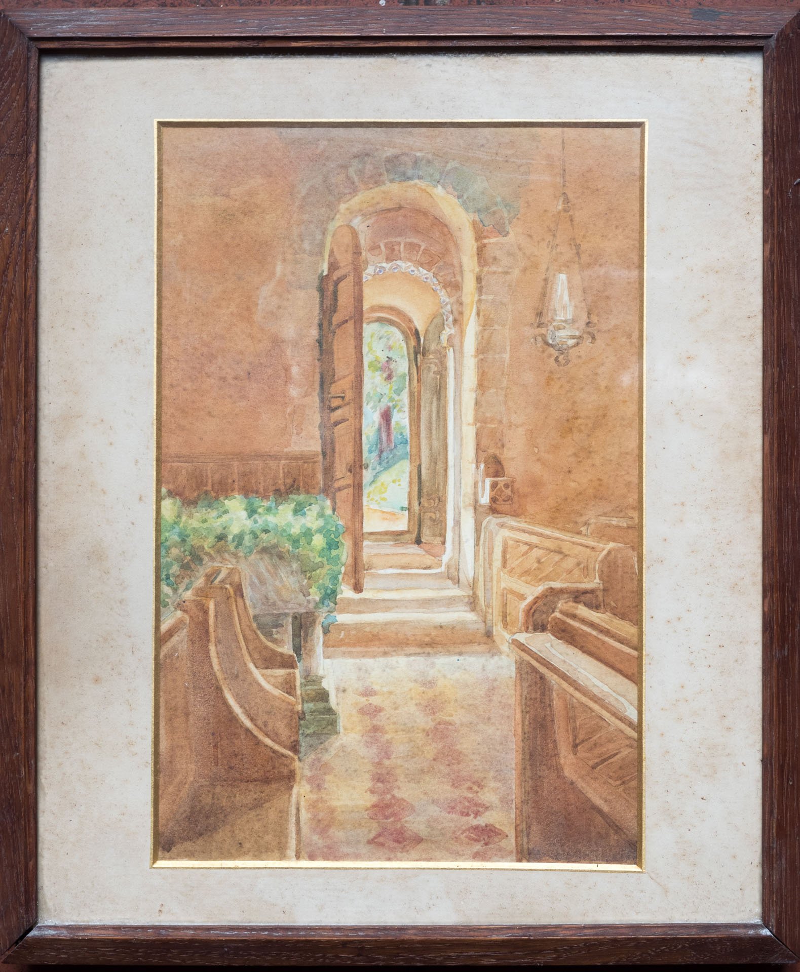 - Watercolour of the entrance to All Saints’ Church, Compton before its 1905 extension, showing the different position of the font. Written on the back: “Irene Whatmore, Larchwood, Compton”