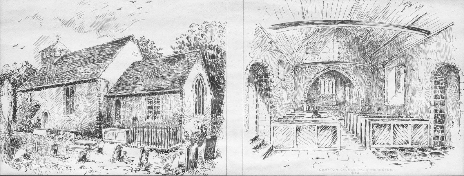 - Pen drawing of All Saints Compton exterior and interior before the 1905 extension