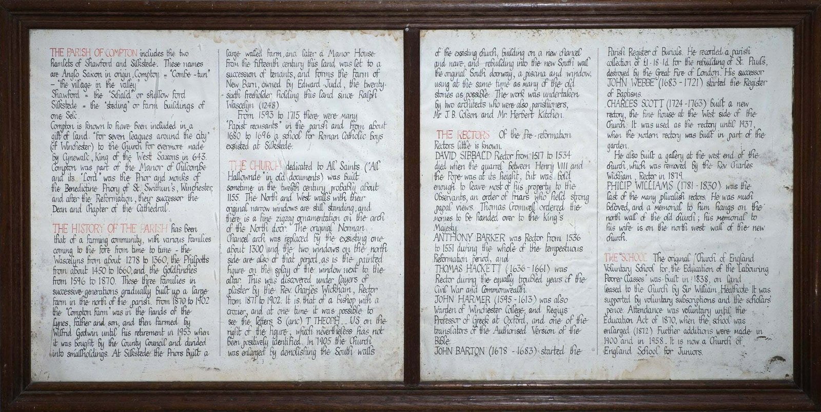 Mrs. Clegg’s summary of the history of Compton and its church has now been reproduced in clear script by Miss Gillian Lowe, and it has replaced the old and inaccurate version (in places referring to a different Compton) under the west window. I would like to thank them both for their giving of so much time and care to this work, which has already been closely studied by a number of visitors.