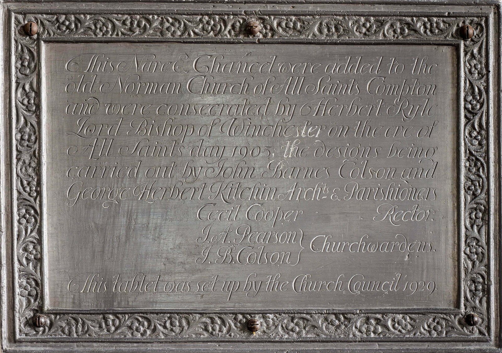 - Pewter plaque commemorating the consecration of the 1905 extension to All Saints Compton.