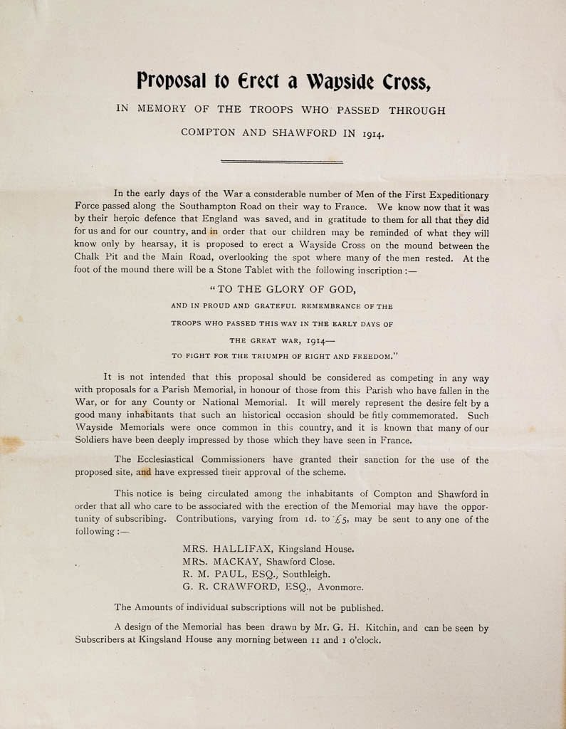 This notice is being circulated among the inhabitants of Compton and Shawford in order that all who care to be associated with the erection of the Memorial may have the opportunity of subscribing. Contributions, varying from 1d to £5, may be sent to any one of the following :—