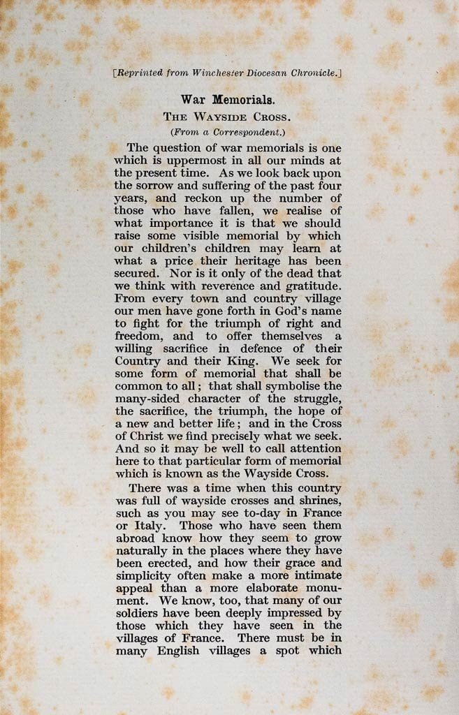 The question of war memorials is one which is uppermost in all our minds at the present time. As we look back upon the sorrow and suffering of the past four years, and reckon up the number of those who have fallen, we realise of what importance it is that we should raise some visible memorial by which our children’s children may learn at what a price their heritage has been secured. Nor is it only of the dead that we think with reverence and gratitude. From every town and country village our men have gone forth in God’s name to fight for the triumph of right and freedom, and to offer themselves a willing sacrifice in defence of their Country and their King. We seek for some form of memorial that shall be common to all; that shall symbolise the many-sided character of the struggle, the sacrifice, the triumph, the hope of a new and better life; and in the Cross of Christ we find precisely what we seek. And so it may be well to call attention here to that particular form of memorial which is known as the Wayside Cross.