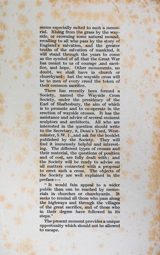 There was a time when this country was full of wayside crosses and shrines, such as you may see to-day in France or Italy. Those who have seen them abroad know how they seem to grow naturally in the places where they have been erected, and how their grace and simplicity often make a more intimate appeal than a more elaborate monument. We know, too, that many of our soldiers have been deeply impressed by those which they have seen in the villages of France. There must be in many English villages a spot which seems especially suited to such a memorial. Rising from the grass by the wayside, or crowning some natural mound, recalling to all who pass by the story of England’s salvation, and the greater truths of the salvation of mankind, it will stand through the years to come as the symbol of all that the Great War has meant to us of courage, and sacrifice, and hope. Other monuments, no doubt, we shall have in church or churchyard; but the wayside cross will be to men of every creed the token of their common sacrifice.