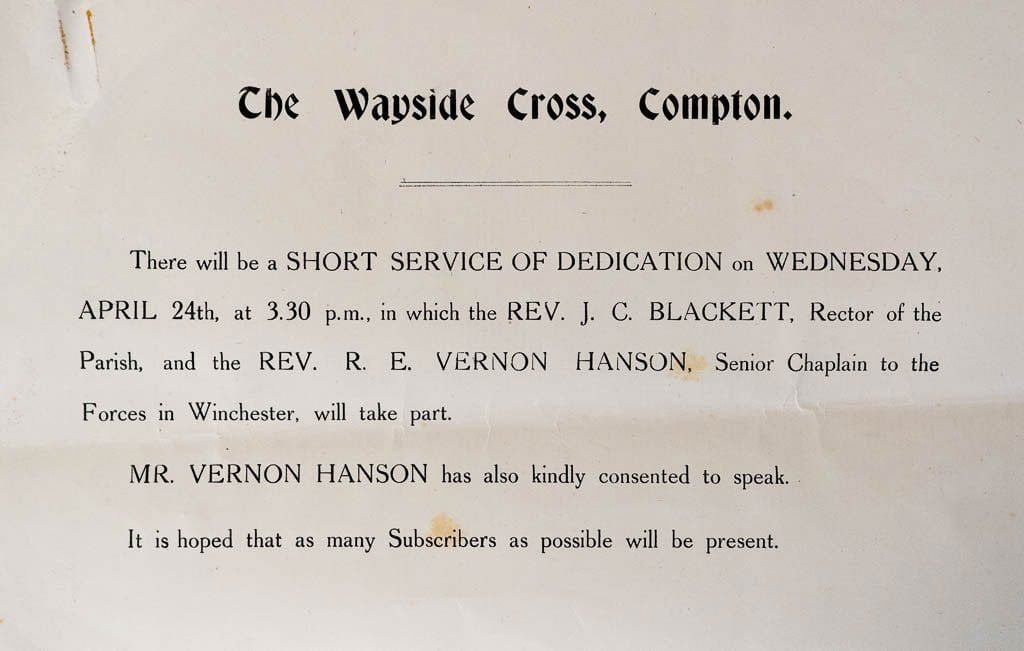 For once, J.S.Drew’s masterly account of our history, “Compton, Near Winchester” gets it wrong. It states that “the Wayside Cross was erected after the War”.
