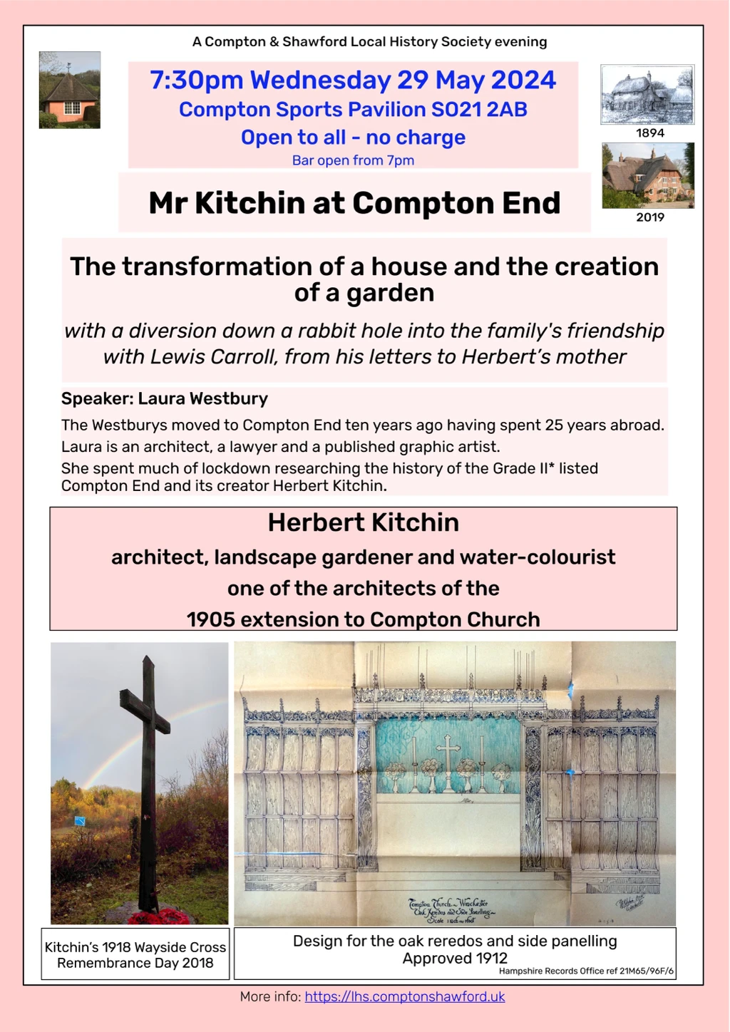 We are delighted that Laura Westbury, who has lived at Compton End for the past ten years, has agreed to talk to us about her research into Compton End and its creator, the prolific local architect Herbert Kitchin.